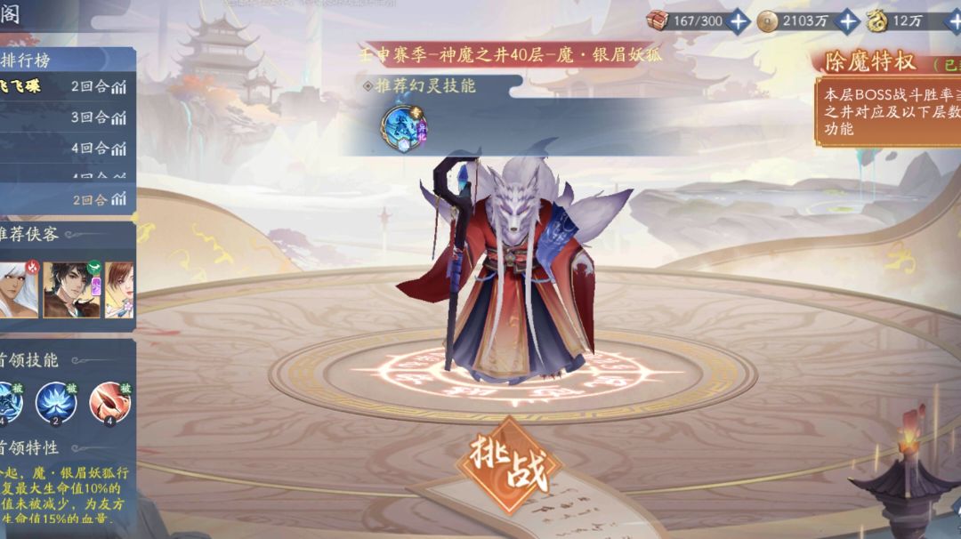 引言: qc竟然还知道改,不过已经通关噜,后续改了以后的攻略照发不误[表情_羞涩][表情_羞涩]下面来介绍一下屎上最难神魔银眉妖狐,大家好我是慢热 一.技能介绍 1.妖异 第2回合起,魔·银眉妖狐行动时为自身恢复最大生命值10%的血量,若恢复值未被减少,为友方全体恢复最大生命值15%的血量,若恢复血量被减少,对敌方全体附加增伤提升30%,可叠加5层,持续至战斗结束 2.银狐 魔·银眉妖狐