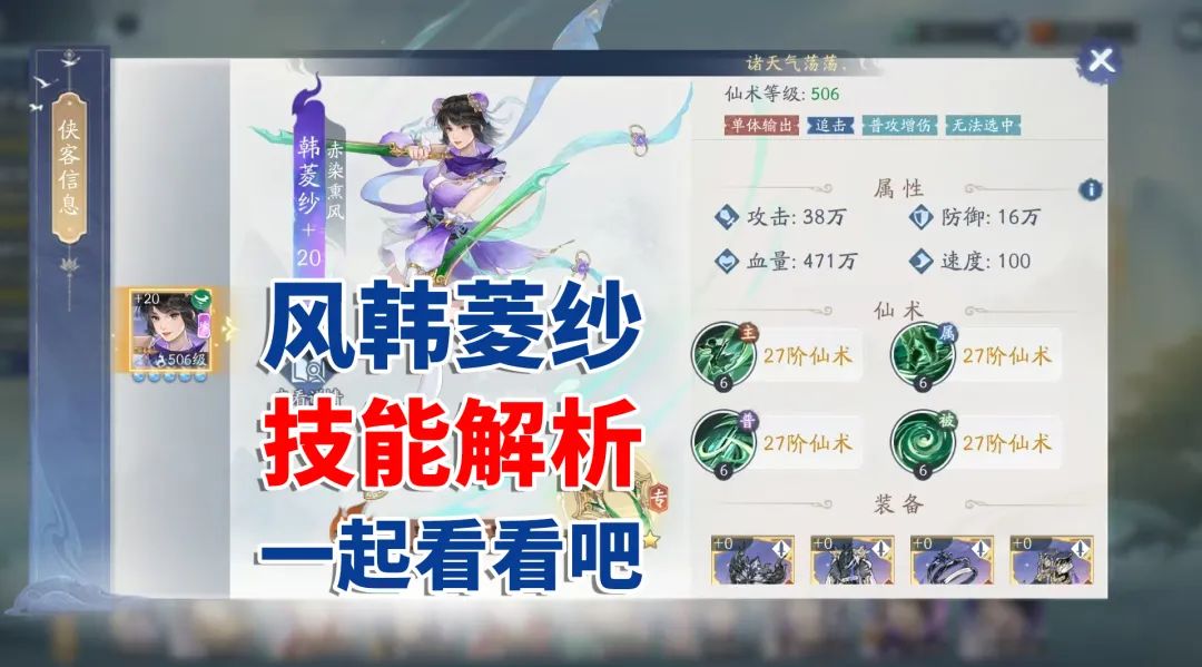 引言: 唐雨柔是继韩菱纱之后的另一张土珍侠客,不过这张卡比韩菱纱强很多,该卡有着独特的机制,且也是用来打神魔3号的。本攻略首先需要了解映珠红、化蝶、玉影、法障等buff,其次会从技能介绍、技能解读、专属仙术、神祝加点及就业范围来一一介绍。大家好我是慢热(水分较大,理性食用,如有需要划到最后面即可) 一.技能特性 1.映珠红:无法获得治疗及恢复效果,行动前扣除自身最大血量的25%(最低保留1%血量