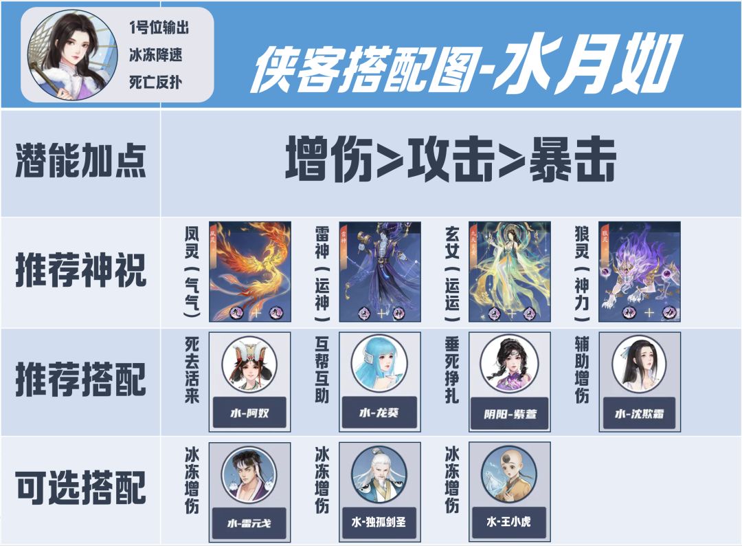 这里是来自官方攻略组的新手攻略。 主打零氪用户的囤囤计划数据和玩法技巧总结。 欢迎收藏点赞关注! 往期攻略集合贴: 水月如升星活动悄无声息的结束了 火77的爆火,水月如的冷遇 莫名跟两位的属性和技能契合起来了 火77的赤火阵伤害爆炸 水月如的寒意、结霜、冰冻,一个比一个冷 还是有点玄学在里面的 虽然冷门,但作为稀有侠客的排面还是要有的 水月如侠客搭配图,闪亮登场 接下来,会从战斗机制、阵容搭配、适