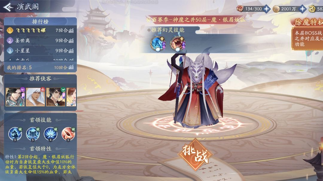 各位小伙伴们大家好,本次给大家带来的是目前来说神魔之井4个boss里面最容易得一个,难点就是需要一只2火宠物,只要有宠物,想打50至少不是什么问题,首先还是了解一下boss的技能,主要就是速度需要高于敌方,并且需要有能够控制敌方的角色,现在就来看一下阵容和配置,如下图所示, 1号位子阴阳徐长卿,承受伤害给后排减伤,神祝是体敏,法法,运道,魂器满,专属1星,S3套 2号位子阴阳剑圣,提供符文防止我方