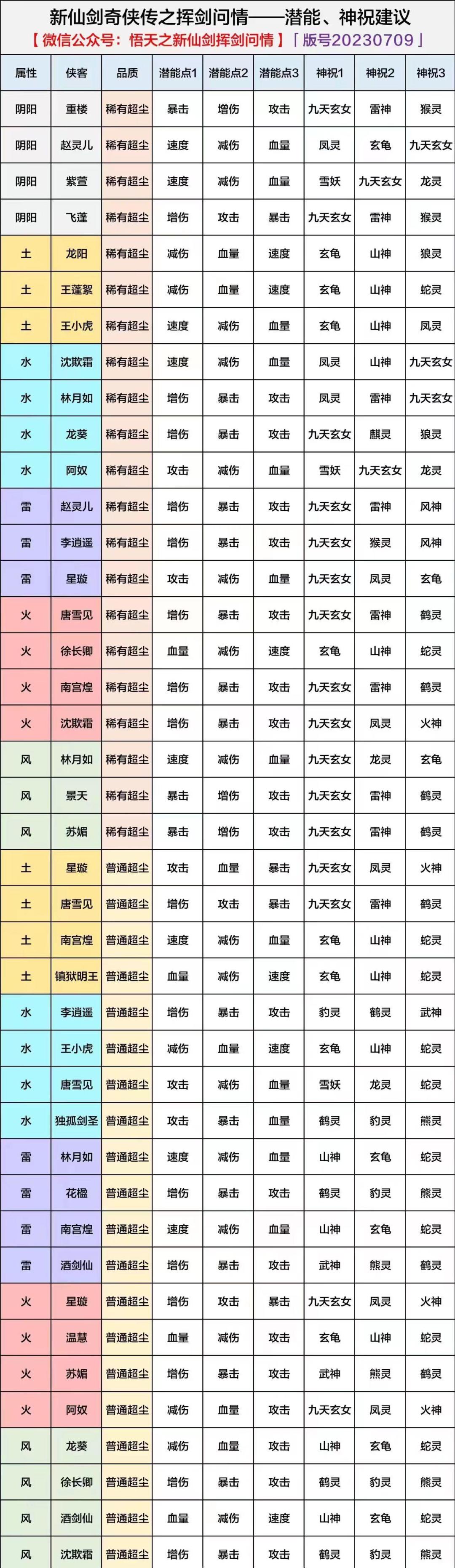 林月如: 潜能:速度+减伤+血量; 神祝:1、运+运(九天玄女)复活;2、神+神(龙灵)治疗提升;3、体+体(玄龟)血量上限; 景天: 潜能:暴击+增伤+攻击; 神祝:1、运+运(九天玄女)复活;2、运+神(雷神)免控;3、敏+敏(鹤灵)暴击率; 苏媚: 潜能:暴击+增伤+攻击; 神祝:1、运+运(九天玄女)复活;2、运+神(雷神)免控;3、敏+敏(鹤灵)暴击率; 龙葵: 潜能:减伤+血量+攻击;