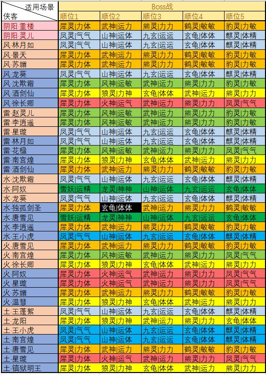 重楼: 潜能:暴击+增伤+攻击; 神祝:1、运+运(九天玄女)复活;2、运+神(雷神)免控;3、神+敏(猴灵)提升暴击; 赵灵儿: 潜能:速度+减伤+血量; 神祝:1、气+气(凤灵)效果命中;2、体+体(玄龟)血量上限;3、运+运(九天玄女)复活; 紫萱: 潜能:速度+减伤+血量; 神祝:1、运+精(雪妖)治疗减伤;2、运+运(九天玄女)复活;3、神+神(龙灵)治疗提升; 飞蓬: 潜能:增伤+攻击