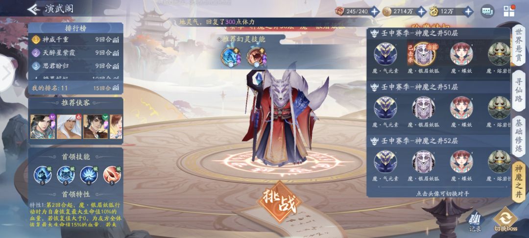 引言: qc竟然还知道改,不过已经通关噜,后续改了以后的攻略照发不误[表情_羞涩][表情_羞涩]下面来介绍一下屎上最难神魔银眉妖狐,大家好我是慢热 一.技能介绍 1.妖异 第2回合起,魔·银眉妖狐行动时为自身恢复最大生命值10%的血量,若恢复值未被减少,为友方全体恢复最大生命值15%的血量,若恢复血量被减少,对敌方全体附加增伤提升30%,可叠加5层,持续至战斗结束 2.银狐 魔·银眉妖狐