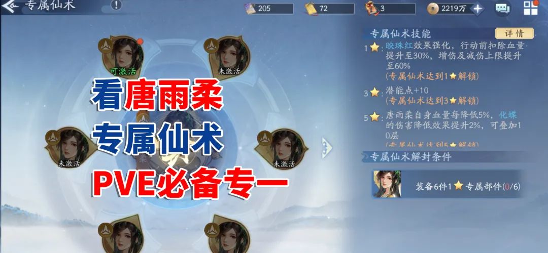 引言: 唐雨柔是继韩菱纱之后的另一张土珍侠客,不过这张卡比韩菱纱强很多,该卡有着独特的机制,且也是用来打神魔3号的。本攻略首先需要了解映珠红、化蝶、玉影、法障等buff,其次会从技能介绍、技能解读、专属仙术、神祝加点及就业范围来一一介绍。大家好我是慢热(水分较大,理性食用,如有需要划到最后面即可) 一.技能特性 1.映珠红:无法获得治疗及恢复效果,行动前扣除自身最大血量的25%(最低保留1%血量