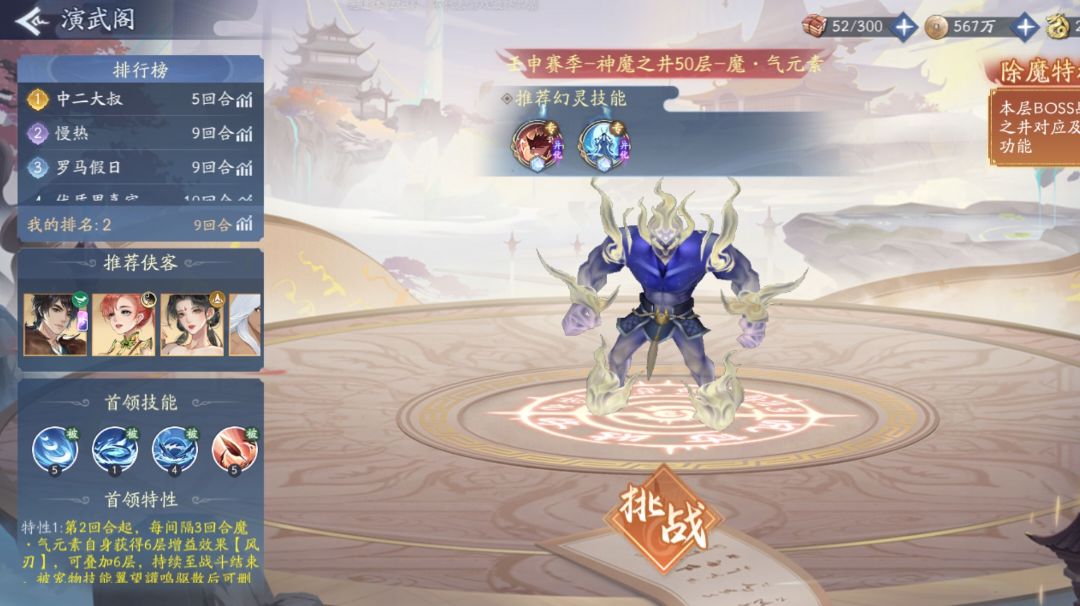 大家好,我是可耐,想低配通关1003的宝宝们跟紧我啦 一、 boss技能介绍 魔·蝶妖及魔·蜻蜓妖减伤提升200%,我方侠客对其附加眩晕效果时,增伤提升50%,可叠加6次,持续至战斗结束,敌方侠客攻击最高侠客首次获得水灵亲和时额外获得攻击及暴伤提升10%,且怒攻附加眩晕时额外提升10%,最多提升至70%,持续至战斗结束 魔·蝶妖及魔·蜻蜓妖免疫控制效果以外的负面状态,行动前解除控制,无法被镇压