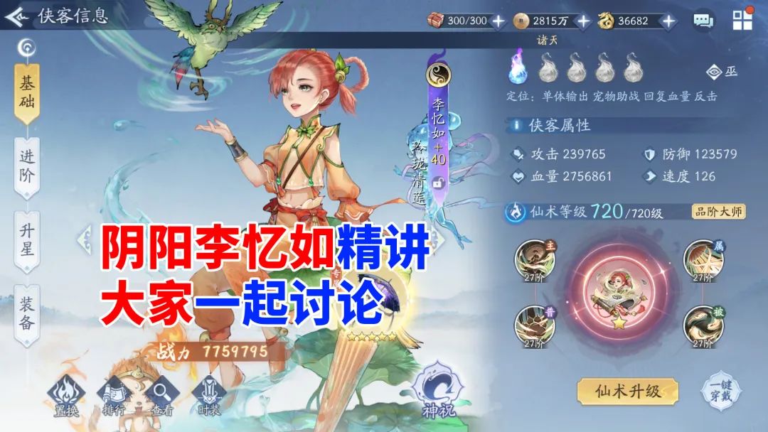 大家好这里是依尘聊游戏,现在依尘就对阴阳李忆如进行讲解,希望能够帮助到大家,也欢迎大家一起讨论(需要调节神魔/世界/PK的小伙伴也可以私信我)。 01侠客定位 阴阳李忆如的定位是辅助、普攻增伤、多重减益,阴阳李忆如是目前唯二可以给队友锁血的侠客,并且锁血优先级高于免死,两回合冷却的锁血,在侠客触发免死后又可以续上,可以衍生出各种骚操作。并且阴阳李忆如还可以强化普攻,是普攻流的核心辅助侠客,自
