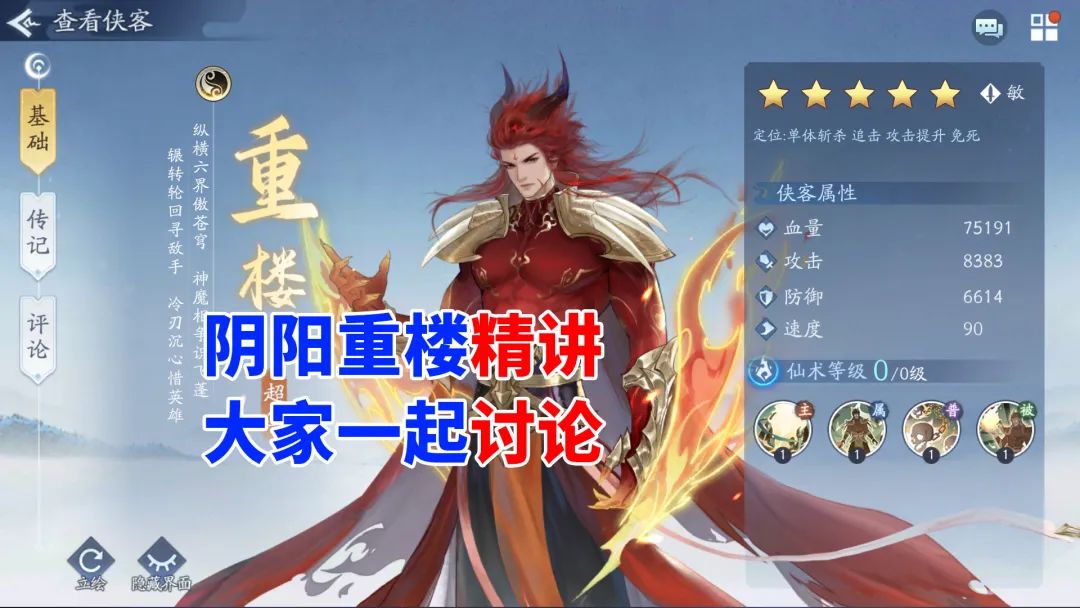 大家好这里是依尘聊游戏,今天我们就对阴阳重楼进行一波精讲,小伙伴有其他想法也可以在评论区留言(需要调节神魔/世界/PK的小伙伴也可以私信我)。 01侠客定位 阴阳重楼的定位是输出,连续收割,在目前的游戏环境中虽然已经不能在一队中发光发热,但在二队,配合宠物猫还是非常强大的存在,宠物猫的技能刚好契合重楼的怒攻收割能力,要知道真实伤害是不受增减伤的影响,依然可以打出爆炸伤害,并且积蓄的冥火也能使用