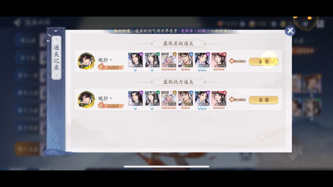 引言 应这位大佬要求今天给大家带来一篇气元素50-1低配攻略,技能就不介绍了点击查看就好 一.侠客要求:云天河,剑圣,徐长卿,柳梦璃,月如,亿如(紫萱) 二.神祝搭配及练度参考 可以看到练度并不算太高,甚至神祝都有点垃圾这个练度应该已经够低了吧 三.阵容搭配及伤害占比 四.幻灵展示 五.注意事项 1.云天河必须满魂器 六.通关视频 七.目前通关极限层数