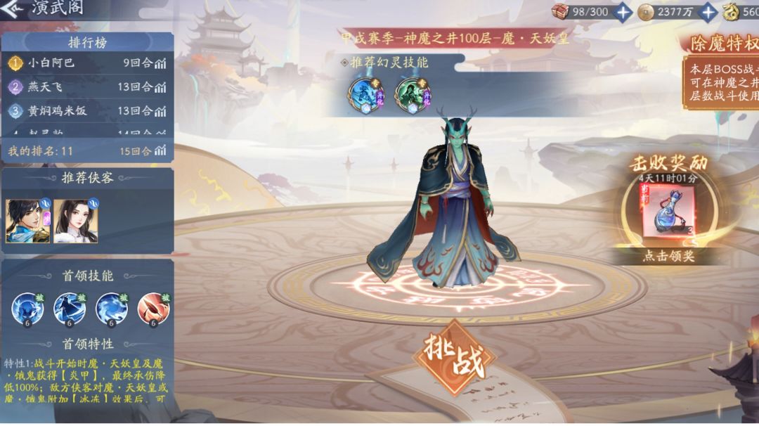 一.练度展示 二.宠物展示 三.通关视频 总结:天妖皇是目前最简单的一个1号神魔了,只需要天河速度达标即可。