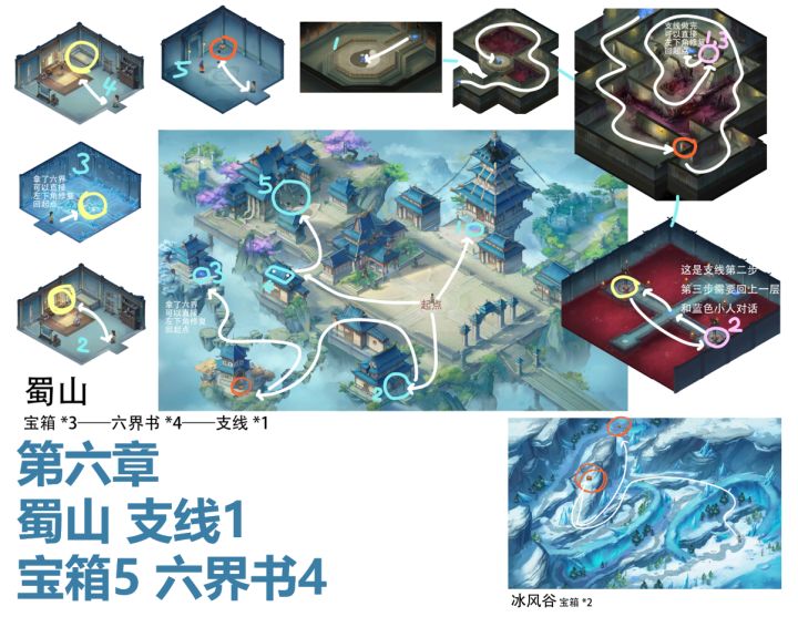 蜀山 冰风谷 共:宝箱*5 六界书*4 支线*1这一章合理利用左下角修复 来少走一点路~
