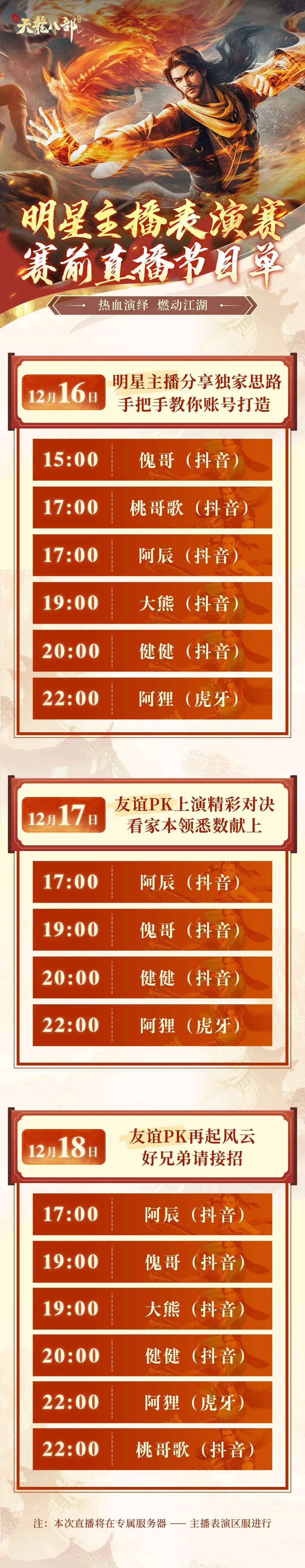 天下风云出我辈,一入江湖岁月催。 自《新天龙八部》手游上线以来,小誉收到最多的私信内容,就是各位少侠询问小誉在游戏里如何养号,如何完美的打造账号?少侠先别急,小誉有情报!在主播争霸赛预选赛开始之前,我们六位明星主播将在比赛专用服手把手的展示自己高超的账号打造经验,并进行友谊PK直播活动,过了这村再没这店,学到就是赚到! 在打造完毕之后,六位明星主播之间还将进行精彩刺激的预选赛,少侠们可以点击下方的