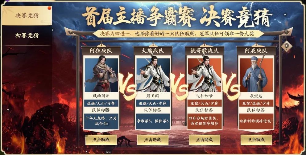 精彩刺激的预选赛终于结束了,让我们恭喜成功晋级决赛的四支明星主播战队,他们分别是阿狸战队、大熊战队、桃哥歌战队和阿辰战队! 错过了预选赛的少侠别难过,明日还有更激烈的主播争霸赛决赛等着大家! 顶级团队,顶级配合!在昨日预选赛的现场,凭借团队成员间超高的默契配合、各具特色的排兵布阵,最终表现更完美的四支队伍成功挺进决赛,接下来让小誉给大家介绍下主播争霸赛决赛的名单和规则吧。 新天龙 主播争霸赛决赛名