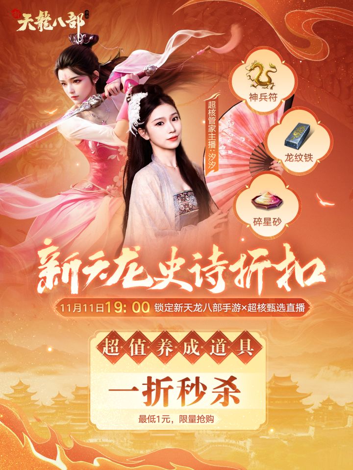 何其有幸,江湖相逢。在和少侠们相处的这么长时间里,小誉真切的感受到了大伙对江湖的喜爱和期盼!为了回馈广大少侠们的支持和厚爱,超核管家即将在11月11日19:00整开启直播特卖会,诸多好礼送不停!重磅折扣 一折秒杀想要行走江湖,养成道具那是必不可少。神兵符、龙纹铁、碎星砂作为当前版本极具性价比的养成道具,本次直播特卖会统统一折秒杀,最低价格低至1元。礼包限量抢购,先到先得!元宝道具 五折限量没有