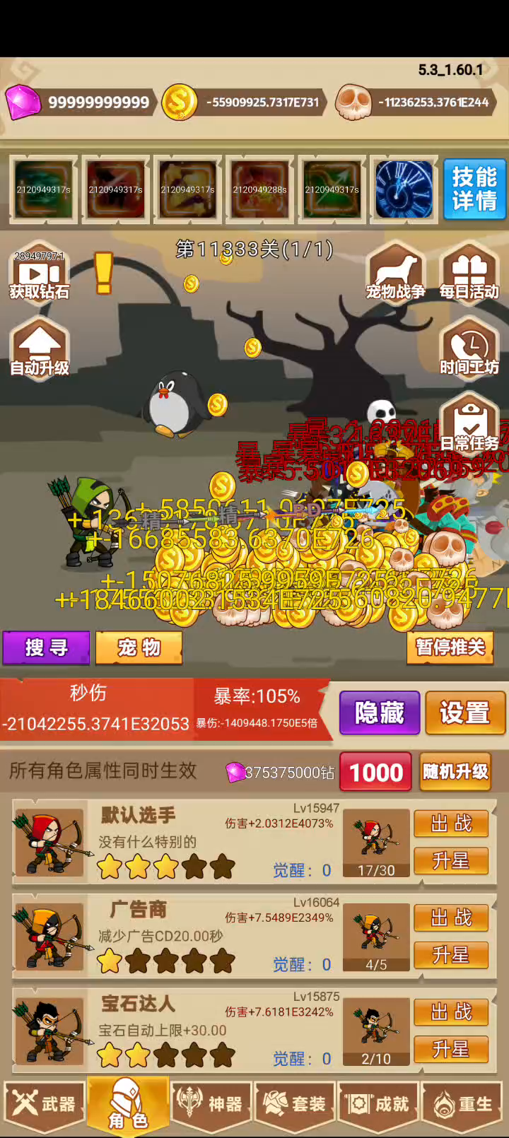 9.30更新内容1. 新增节日活动(节日才会显示此功能,需要10.1出现)2. 新增宠物战争功能(一种特殊玩法,扩展,扩展就是款新游戏……)3. 新增挂件属性统计(不显示基础白色属性及变异箭属性)4. 修改重生MAX加点数据不对的BUG 。5. 重生技能跳跃消耗降为原来的1/10 (更新后重生界面点击重置会返还多消耗的重生点)6. 自动升级为100关后可用 ,开关状态切换,不再消耗钻石