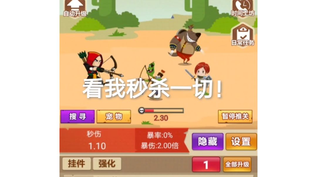我也是第一次写这么长,不好不要喷哈,毕竟自己用,和大家分享一下,如果有什么不对的地方那就请大佬赐教 装备 第一个框我以-全部伤害-为主,越高越好 第二个框是刷装备用,可以短时间让你装备换下一个等级全金,多于的装备可看广告自动分解,有掉率就行,不太需要看装备等级,有好的就换就行了,不然也打不动当前关卡的怪不是。 第三个框我是刷的属性全部都是砖石,明显没有第二个框好使,也可能是我没有多试几次,但是个人感觉刷装备快 其次就是战魂和金币,但是有神器加成就行了,装备的属性不要战魂和金币也行 角色 祈神者:神器属性加成,前期不是很明显,后期应该还可以,当前视频目前上阵可以让我在打不动关卡的基础上再冲两三千以上不是问题 子龙:强化箭羽之前一定要出战-子龙-,不要问为什么 砍价商人:和子龙一样,升级角色之前一定要先出战-砍价商人-,不要问为什么。 挂件商人:如果是和我一样看完广告,然后自动分解装备挂机的小伙伴可以在下游戏之前把-挂件商人-出战, 以上的角色都是常用的,角色升级的属性就是角色等级下面的小红字,它们伤害属性是一起生效的,不和它们的特殊属性一样,特殊属性都在名字下面写小白字,就像上面说的一样,想要用某个角色的特殊属性一定要先出战,不然你用不上它的特殊属性。 以上就是我自己的小攻略,希望对你有帮助。
