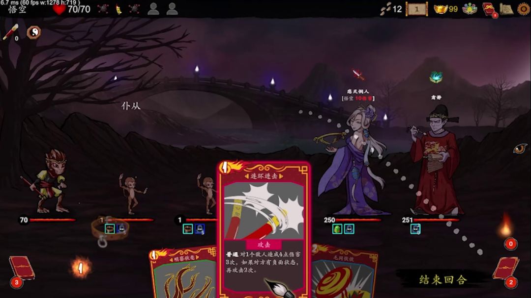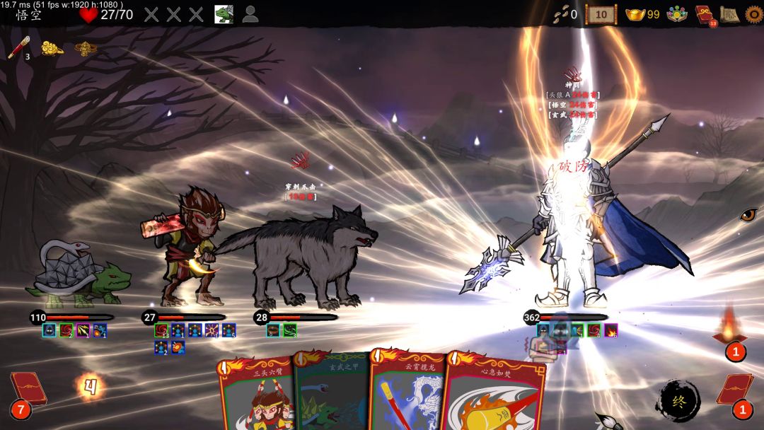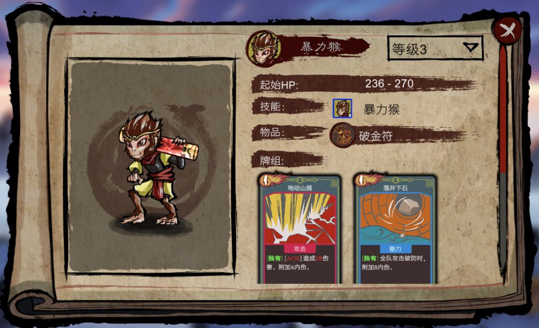 《神州志:西游》的完整版游戏在,,以及咱们爱发电的安卓和iOS的内测版)同步更新中! 本周我们继续加入新同伴和新法宝,完成了第四章和结局的英文版,进行了不少卡牌调整和增强,并且在新人物八戒的开发上也稳步前进。目前八戒75张牌的代码实现,特效基本完成,正在制作动作、音效和绘制八戒的卡牌中。 暴力猴是悟空的力量分身,利用攻击打出内伤来增强伤害。通关悟空试炼1之后即可解锁 本周加入了2个新法宝:破金符(