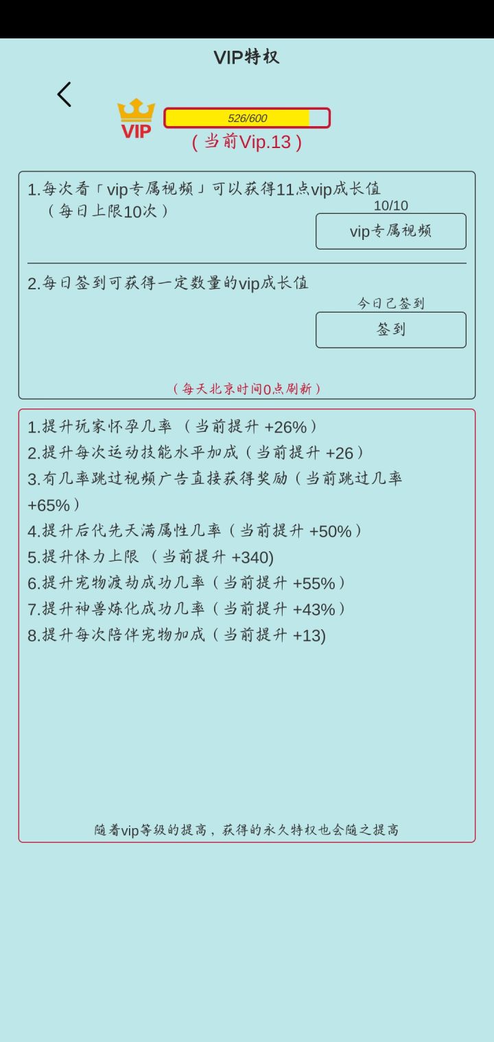 关于VIP,也是让我无语了,希望VIP签到能改为前五次免费得到,后五次可看广告双倍获得。而且先天性满属性怎么这么难得到呀!我不懈努力将满属性弄得50%的几率居然小的可怜,气死我了,概率出现希望能增多!