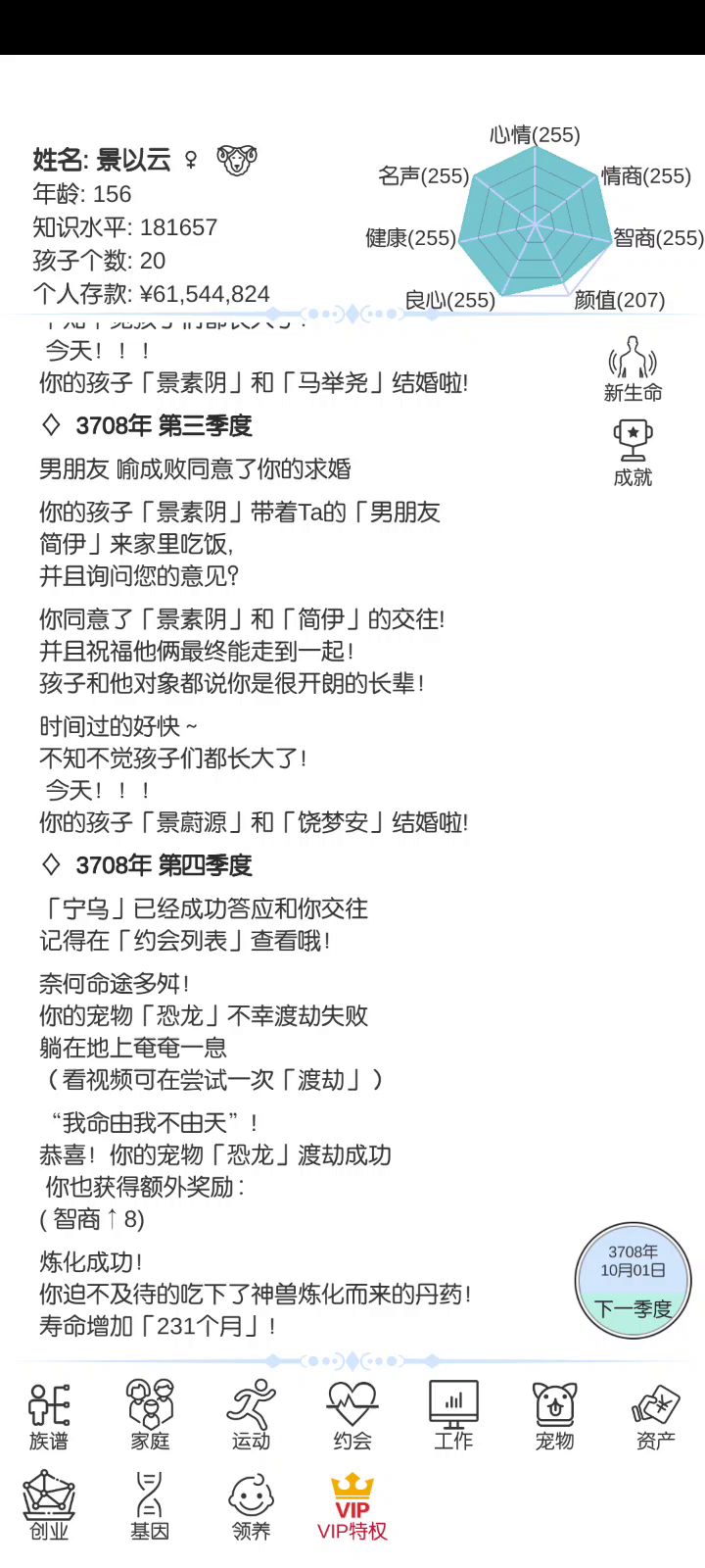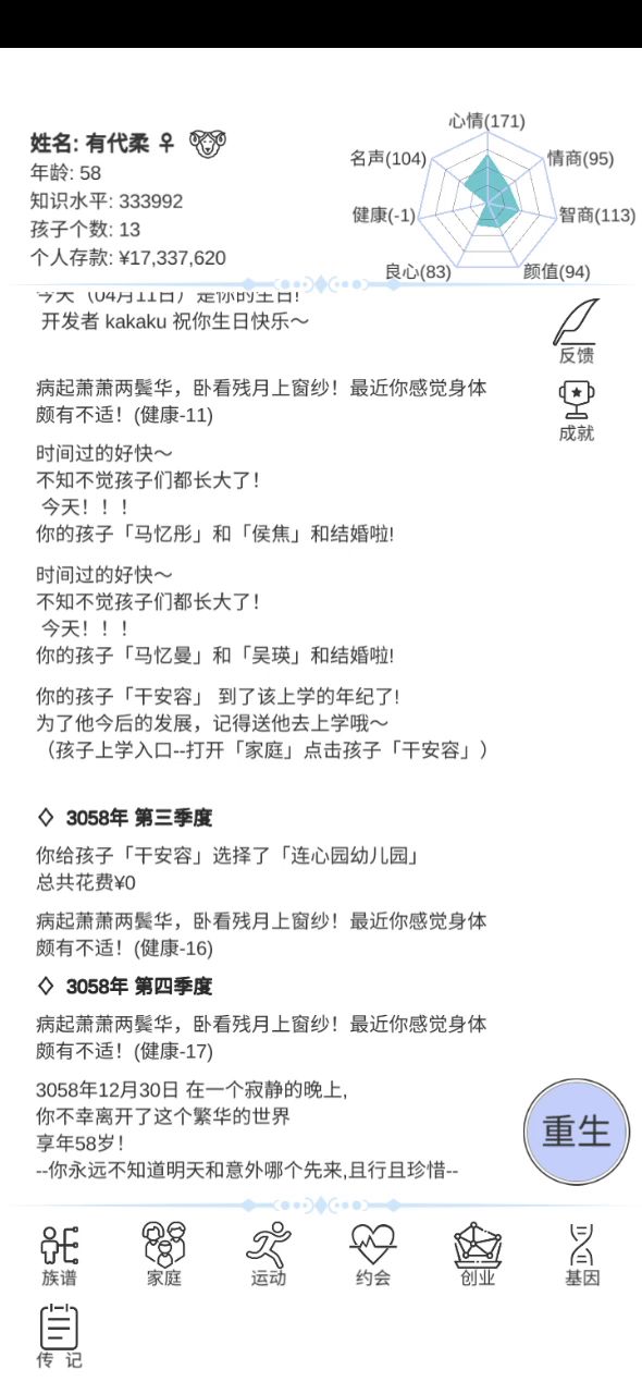 暴富的方法在这里和长寿的方法在这里(不全,看我的其他攻略贴 一. 暴富 1. 最推荐通过结婚暴富 十八岁以后就开始邂逅对象,多邂逅几个!!!(之后每隔几年就要去邂逅!!!)这个时候遇见的都是三十几岁的,这个年龄差就会导致他们死的早,你们懂得吧,遗产这不就来了嘛,一般通过高级就会邂逅,七八十的时候遗产在10,000,000~20,000,000。这个时候之前邂逅的人也七八十了,找他们搞对象然后结婚,死了找下一个。因为之前每隔几年就邂逅,所以咱们的鱼塘可大了,啥年龄段都有,这样死了一波又有一波,钱这不就伸手就来的事嘛 这里有个小技巧😈:看鱼鱼们的健康值,只要减少超过9点10点,基本上都要死翘翘了,高级酒会的鱼鱼们健康值少于100点就赶紧上,老头好呀,老头有遗产hhh 这条暴富方法不好的就是到自己七八十岁也要死了