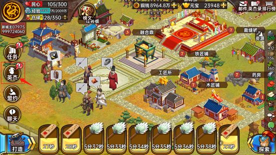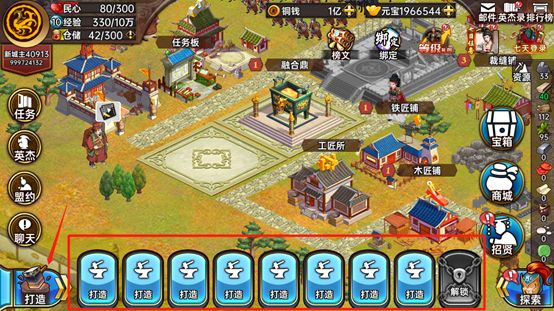 打造系统是《华夏英杰录》核心玩法之一,游戏中的装备来源最主要的途径就是打造。下面我们来了解下装备是如何打造出来的。打造槽主公们可以通过点击打造按钮来激活打造槽,同时最右侧的资源栏也会同时显示。初始状态只有一个可使用的打造槽,花费铜钱或元宝可以开启更多的打造槽,并可以为打造槽升级。图谱只有解锁了的图谱,才可以打造对应的装备,没有解锁的图谱是无法进行打造的。图谱的稀有度越高,则价值也就越高