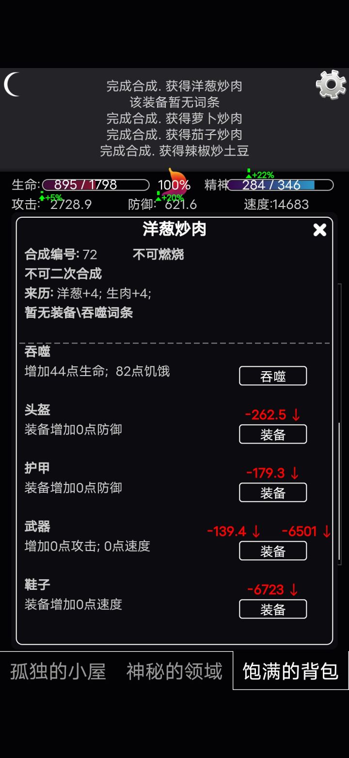 第一个困难档,刚刚把最后一个boss打完,差点饿死,打完之后食物都准备好了,结果告诉我通关了。我在探(zuo)索(si)过程中,发现了多个重要的特性,估计正式版会修掉,下面是一些特性利用的分享。一,吃石头这个游戏,是可以吃非食物的,开始我并没有觉得他很可怕,直到我发现采集获得的材料是真的多,然后我直接长按吞噬,吃了几十个石头,防御数值超过前期几个小怪,就可以无伤了。这个特性前期十分好用,第