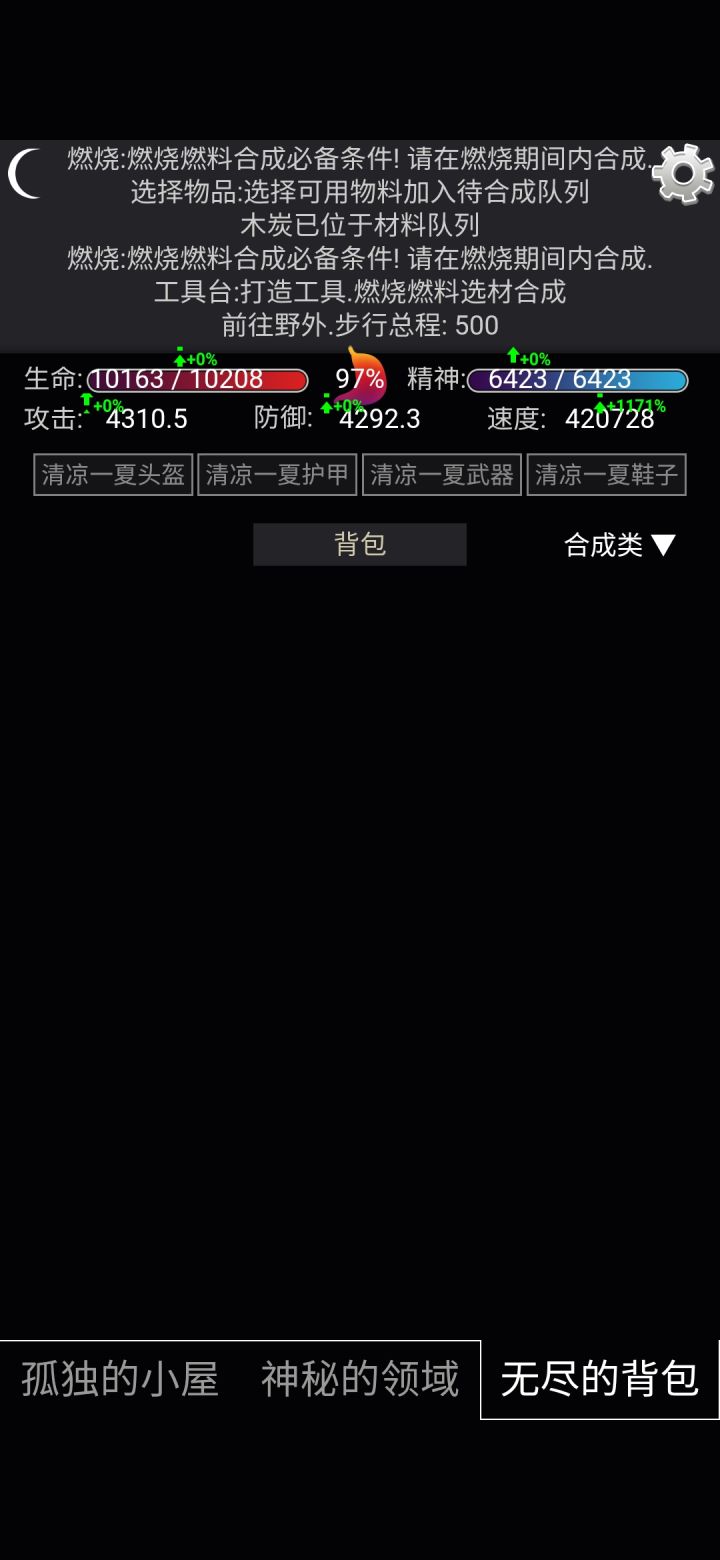 如图,清凉一夏可以装备,并且加速效果完全生效,由此可以带来巨额百分比移速加成缺点:目前实战意义不大: 1刷道具的时候有固定采集(一帧攻击,一帧移动)时间,速度过万之后,大概移动速度就没有用了 2清凉一夏作为装备,只能以裸装速度为增加基础,没次齿轮就不如皮孩(鞋子)/宝石刀(武器) 3这坑爹玩意原材料还要种,极度浪费时间 综上所述,本套装只用来摆设。。。。直到开放更多楼层,如此,需要更高的移动速度。。。 ๛ก(ー̀ωー́ก) (明 示 更 新) (*•̀ᴗ•́*)و ̑̑