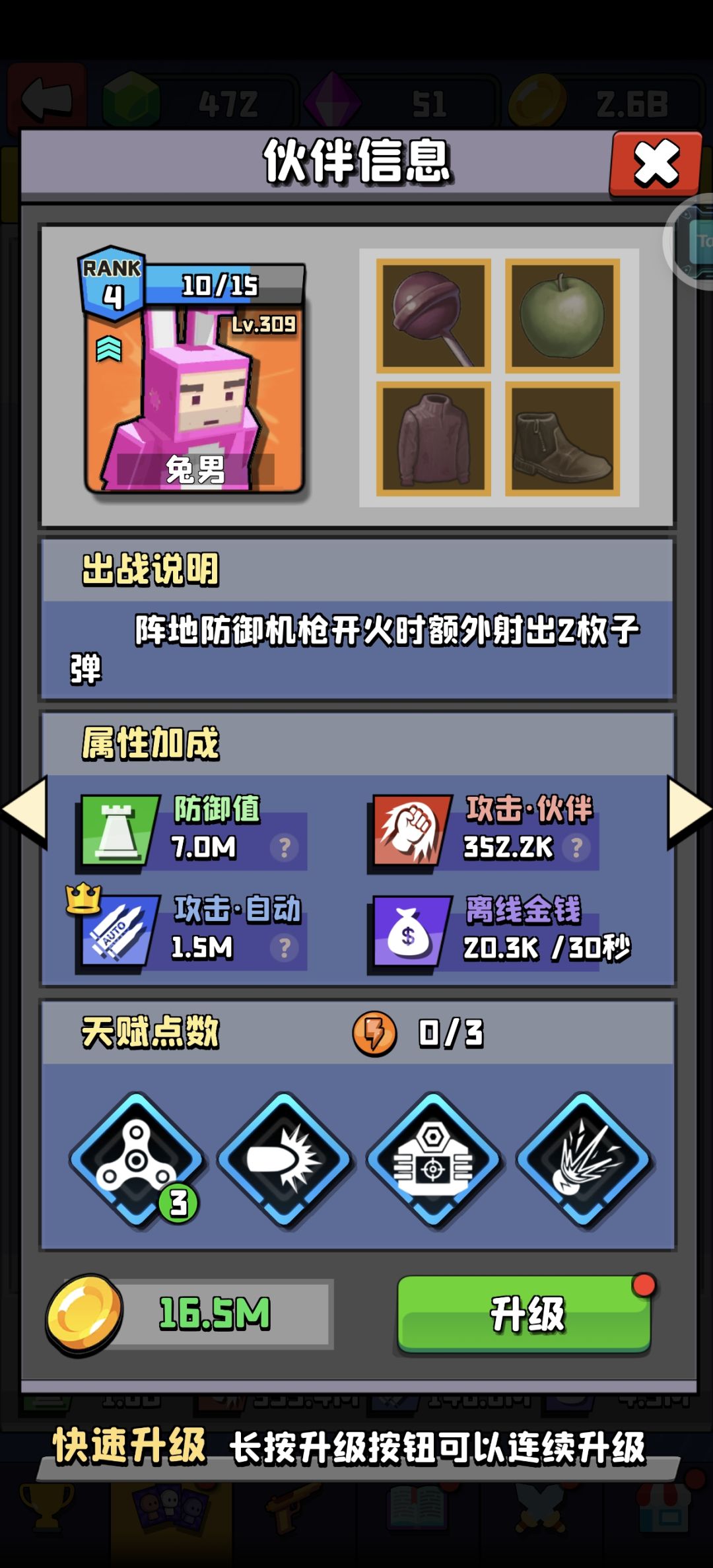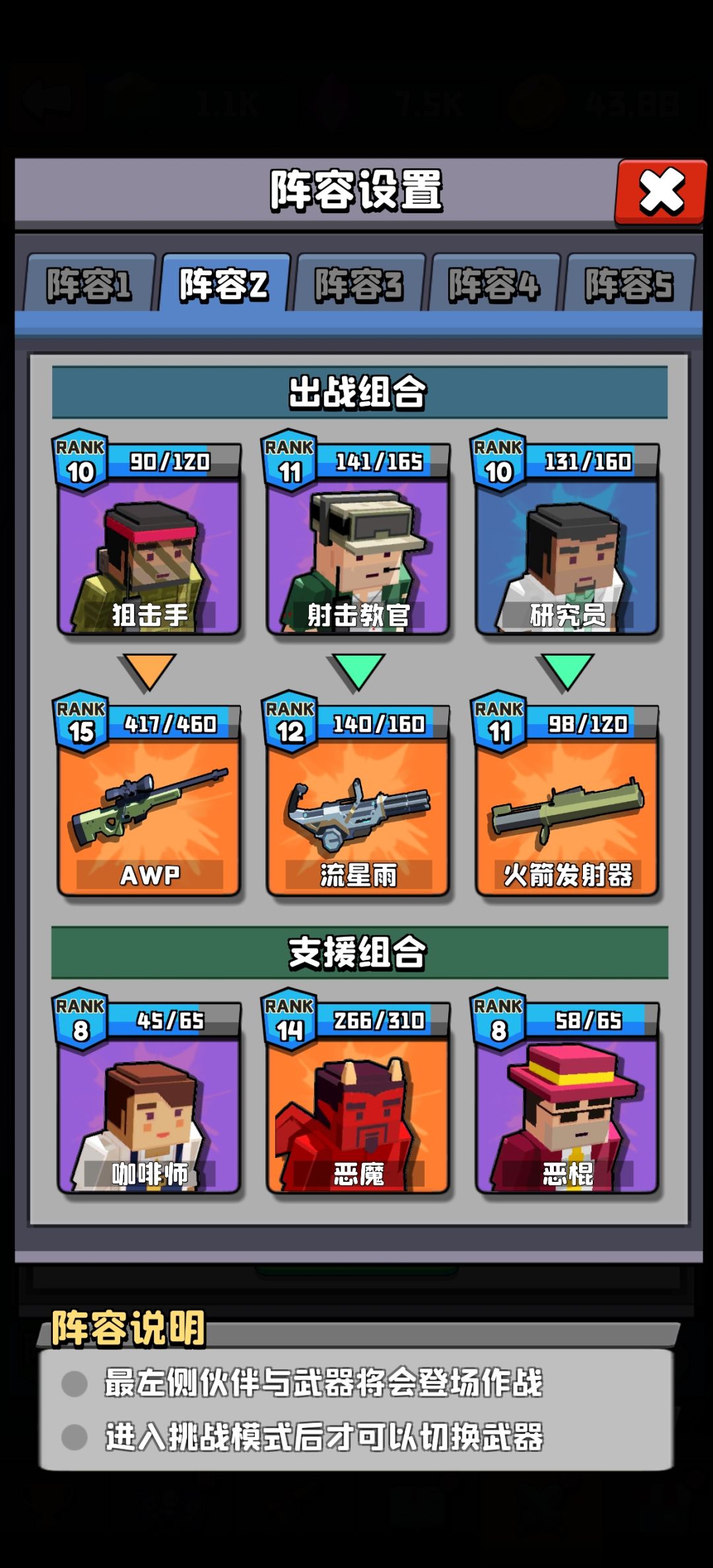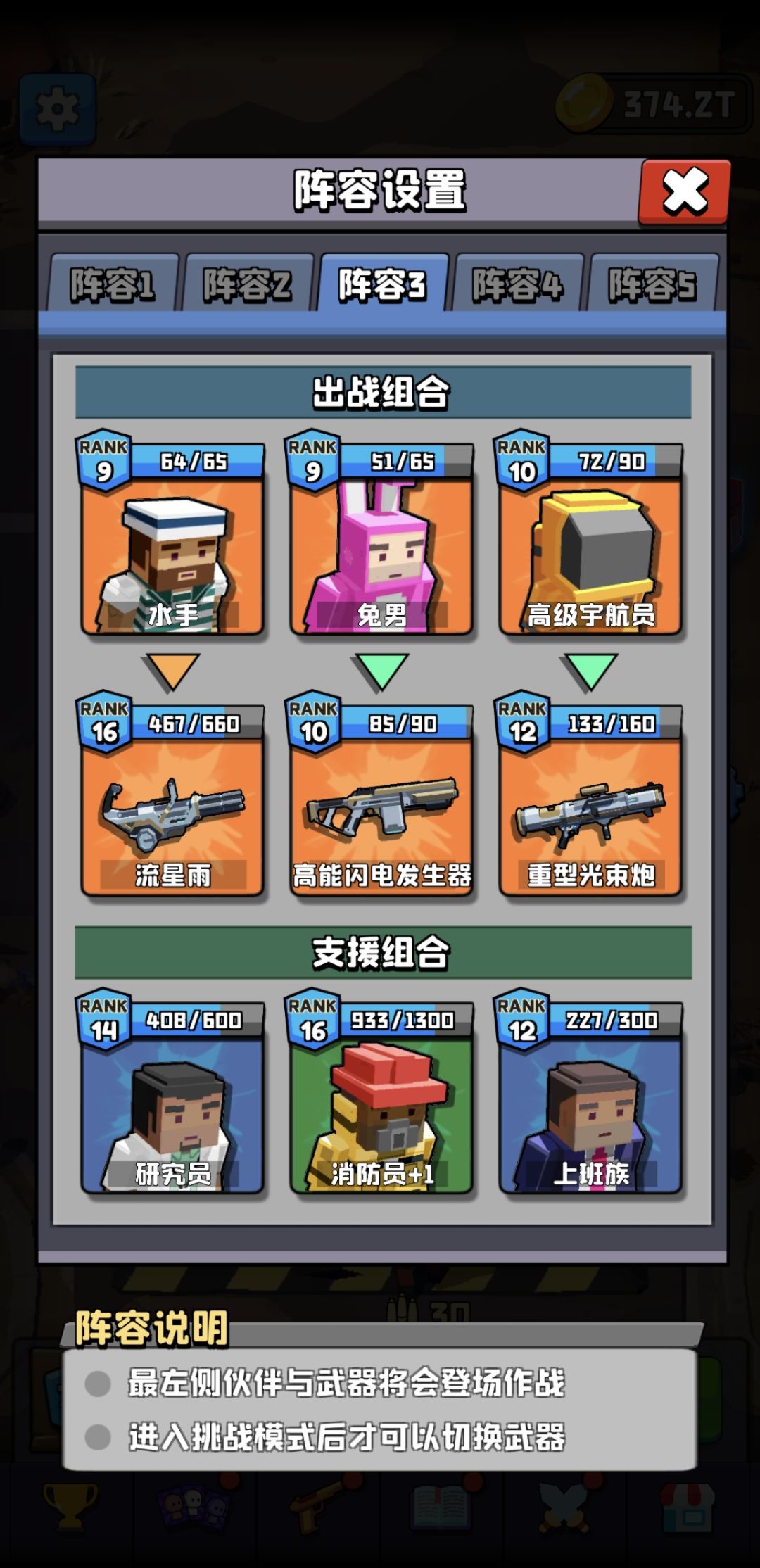 图一-个人认为重要的武器 图二-技能配合重要的角色+运动员4技巧 图三-个人爱用,三傻加自选支援。 挂机阵容-三傻,流浪汉2技,水手2技,圣诞老人全技。技能自己选,无需多说 暂时关卡360附近