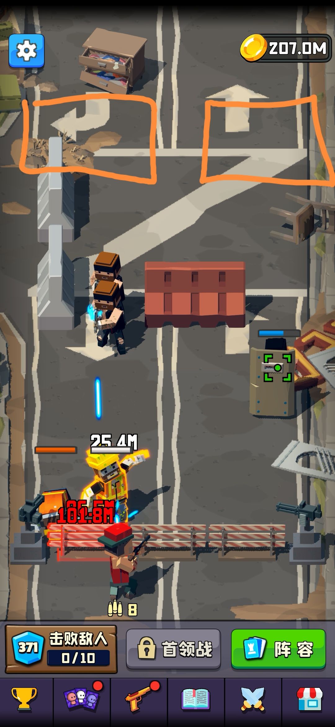 这关有带炸药包的敌人,把下图这两个位置的建筑物炸掉后,最后两个炸药包的敌人就不会从传送门走,会跟着boss,然后点掉炸药包就可以提高对boss输出。