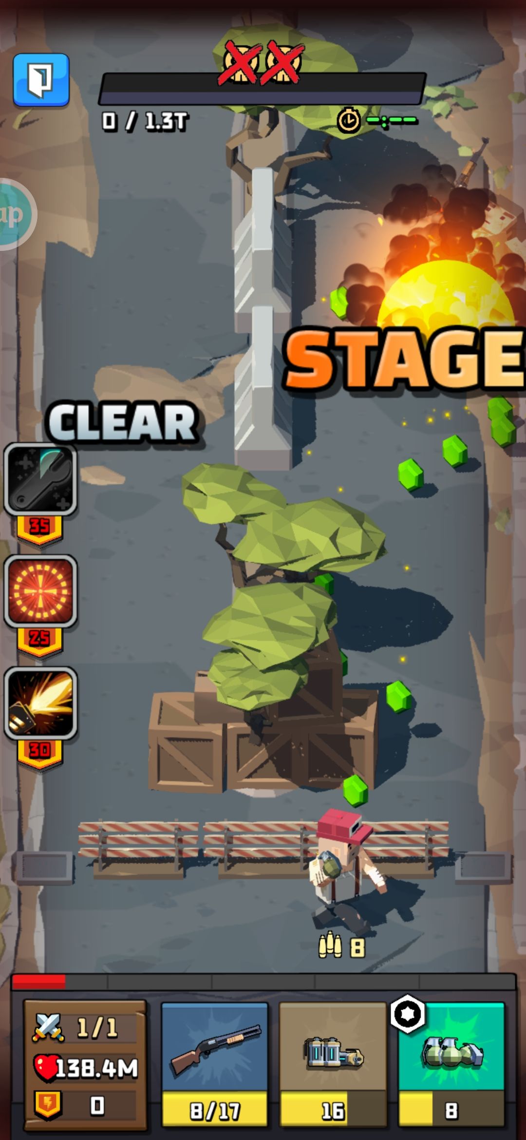 这关难度太高,对血量和远程爆发输出都有要求,血量起码要扛住boss两次攻击,这关一般过法是用手雷炸开中间的树,但这样时间容易来不及,所以这里我采用的是控制手雷的落点,避开中间的障碍节省时间,而且把手雷提升到14级,能量手雷提升到12级。