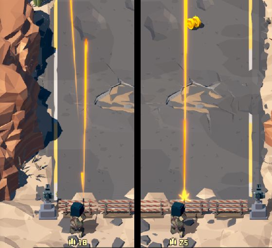 《暴走枪手》在战斗操作上跟其他休闲射击游戏有很大的不同。游戏中武器的品质并不代表属性强弱,而仅仅代表武器的获取难易程度。每把武器在战斗中都有自己适用性,玩家需要根据具体的关卡设计来随时调整自己的伙伴以及武器搭配。1. 武器的基本操作在游戏中,武器的主要操作方式有点击和长按两种。以自动步枪为例,点击屏幕会触发点射效果,长按屏幕会触发连射效果。 如上图,左侧是连射时的弹道效果,右侧是点射时的弹道