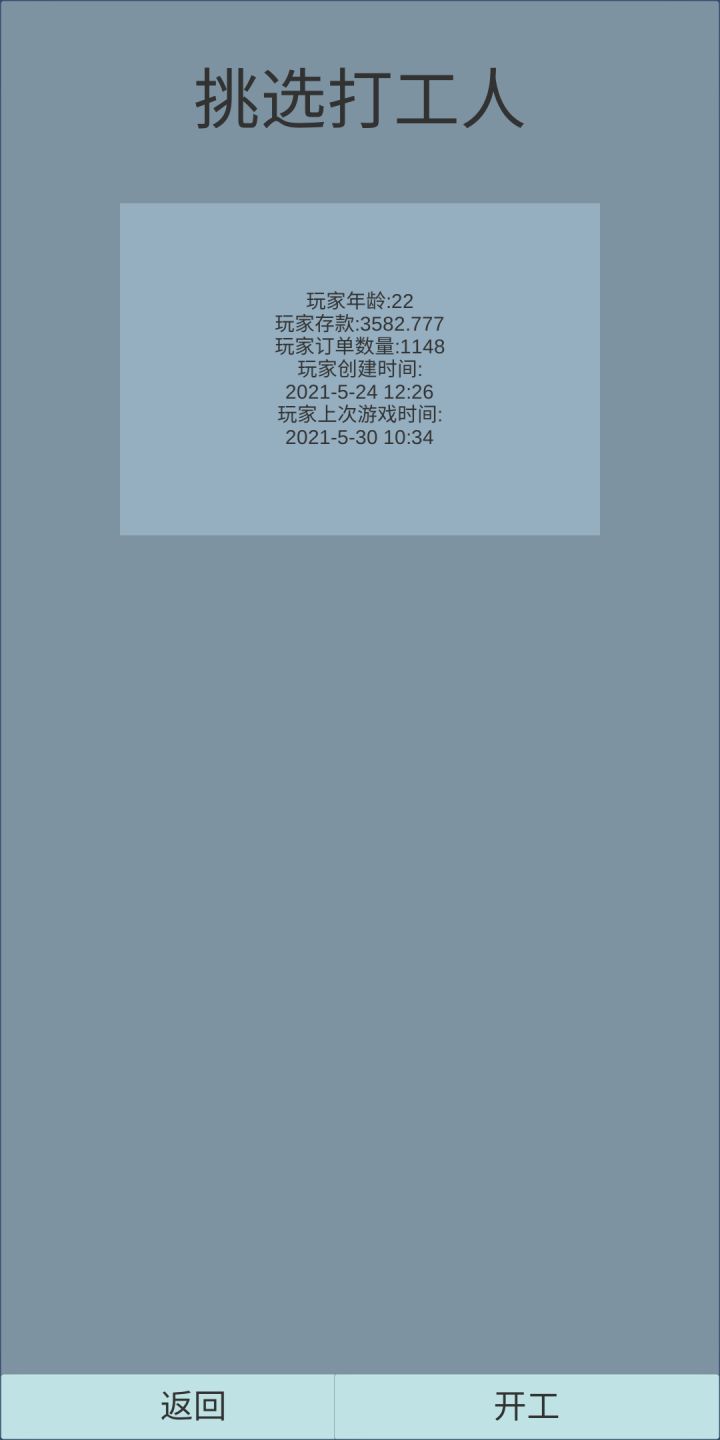 1.游戏并不是实时更新数据的.因为云服务器实时更新的话可能话直接炸掉.游戏的数据更新是在 你选择打工人的时候进行刷新.想要刷新自己的数据,可以重新选择一下角色.2.游戏准时率的统计,玩家单量必须大于50单.祝大家游戏愉快.有什么bug及时回复和反馈给我.谢谢啦