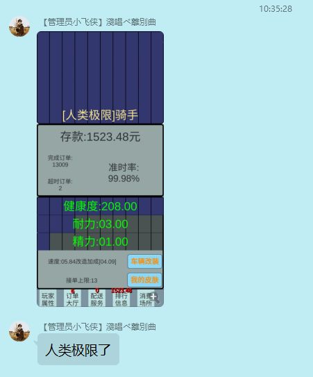 双十一玩法更新:1.接单时显示当前订单价格,订单价格为20-300元随机。2.添加出餐时间,玩家在接到订单后,需要等待订单被餐家制作完成后才能进行接单。订单出餐时间为订单价格/20。3.由于玩法复杂度的调整,玩家会获得订单价格/10的额外奖励。双十一活动相关:1.签到活动,11月11号开始签到活动,活动期间,玩家每天可以签到一次。 每天签到领取基本改造券5张,加累计签到天数的改造券,如累计签到7天,则获得5+7张。 每天签到领取基本存款50元,加累计签到天数*50的存款,如累计签到7天,则获得50+50*累计签到天数。 每天签到后可以获得一个改造券宝箱。 累计签到一次时,可以获得一次存款随机1-7倍的奖励。 累计签到七次时,可以获得一次存款随机3-10倍的奖励。2.开放双十一卡池.常规物品获取几率修改为11.1%。玩法优化,bug修复:1.改造时候后会增加提示:改造+11之后失败会让改造等级归0的提示。2.修复改造卡使用过的问题,改造卡可以存档。