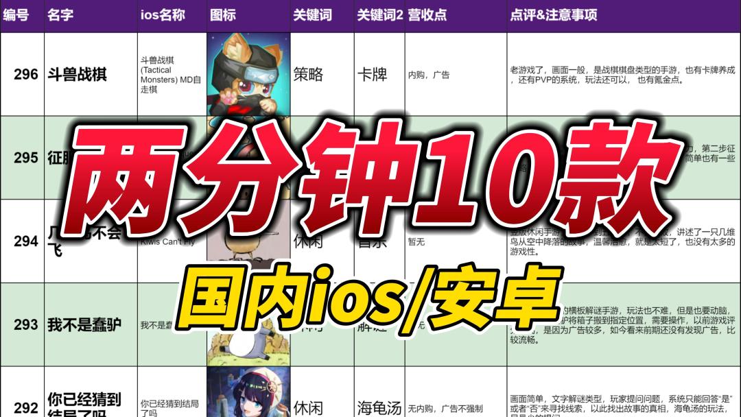 视频结尾有表格详细介绍, 国内ios10款不错可玩的手游,当前可玩,安卓大部分也有, 本期游戏中,观众们有特别感兴趣的可以留言, 后面可以详细单独介绍一下。 游戏ios名字,可搜———— >斗兽战棋 (Tactical Monsters) MD自走棋; >World Conquest: War & Strategy; >Kiwis Can't Fly; >我不是蠢驴; >你已经猜到结局了吗; >任务精英:3D离线FPS; >Hexaturn!; >The Magic Ink; >羊喷喷疯了!; >超级幻影猫2。
