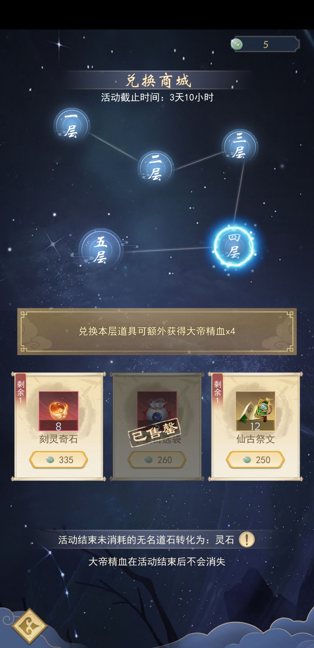 一、开服第四至七日活动 【九重天阶】:福利活动,每日日常完成即可做满,没有难度。 【天选活动】:主c冲星活动,选荒天帝,一般不氪金差距不大。 【群英大会】:仙阶卡冲星活动,同天选差不多。 二、低级轮换周活动 三个活动每周轮换,顺序为炼丹—铸器—论道 【炼丹】:所需材料为不死灵株,主要产物为丹药炼制材料。 【铸器】:所需材料为干将之火,主要产物紫云晶,装备铸造材料。 【论道】:所需材料为大帝精血,主