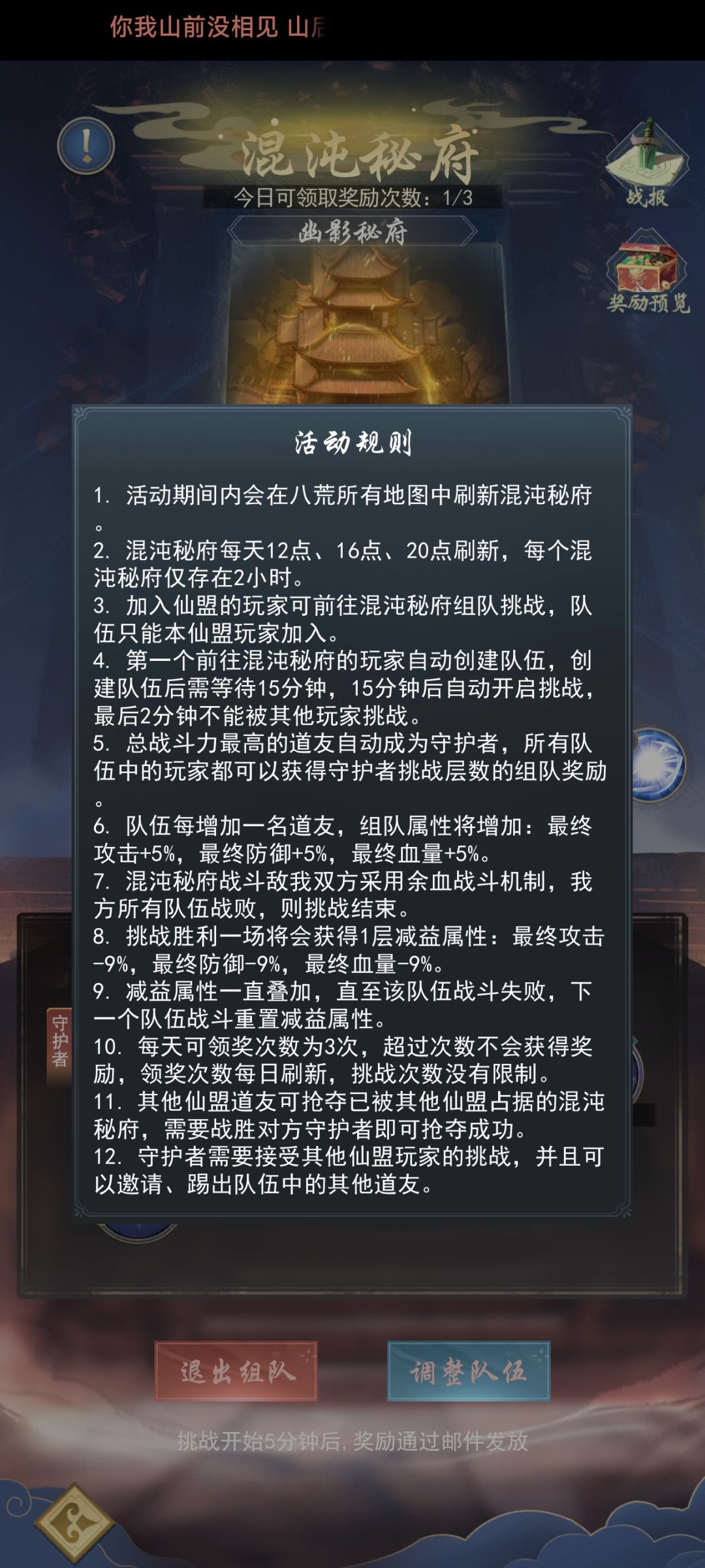 考虑到秘府活动即将成为常驻,本次为正式服测试,特出此贴 从图中规则能看到会采取余血机制,以及战胜之后会有递增的debuff效果,建议大家把弱队往前面放,毕竟每一关的难度是逐渐递增的。 其中太古神界跟星宇海是双队,大家自行搭配一下怎么合适就好,九界山就到三队啦。十万大荒跟道玄域不清楚。 每天可以领取三次奖励,可获得道具每天中午十二点,下午四点以及晚上八点会刷新,各位道友可以看个人需求打。 建议:可以
