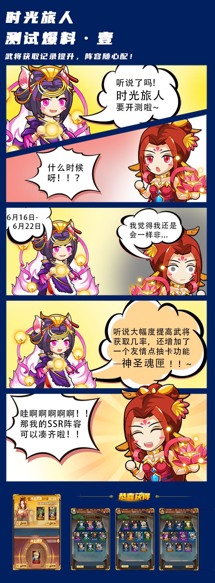 经过无数次的测试和优化,《时光旅人》已经开测啦~谢谢大家的参与与支持 听策划小哥说这次开测大大提高了武将的获取几率。 What??怎么回事??? 策划小哥这是良心发现了吗? 今天美美就为大家来一次开测大爆料。 原来如此,新功能“神圣魂匣”的确可以很好地帮各位主公集齐所需的武将阵容, 那么我们来看看新功能到底怎么使用吧~ 首先我们在界面点击“招募”就能看到“神将招募”和“神圣魂匣”。 点击“神将招募