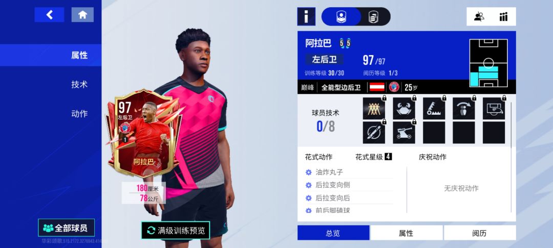 兑换建议:这张阿拉巴数据上毋庸置疑是强度在线的,但是非常尴尬对比96精选特奥优势没有特别明显,在中后卫与后腰位置上也有许多平替可以选择,新入坑的萌新在资源足够的情况下可以酌情兑换,老玩家急需补强后腰或者左后卫位置也可以酌情兑换,但阿拉巴我个人觉得是不太值得这个造价的,总体推荐指数4.5/(满分5) 强度分析:这张阿拉巴数据上是一个高速攻守兼备的全能型边后卫,在左后卫与后腰位置上都能有不错的表现,但