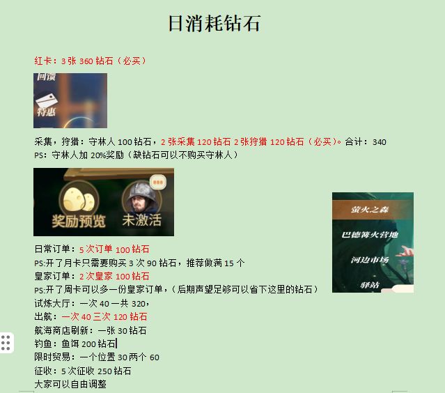 红卡:3张360钻石(推荐买) 采集,狩猎:守林人100钻石,2张采集120钻石2张狩猎120钻石(推荐买)。 PS:守林人加20%奖励(缺钻石可以不购买守林人) 日常订单:5次订单100钻石,(推荐买) PS:开了月卡只需要购买3次90钻石,做满15个 皇家订单:2次皇家100钻石(推荐买) PS:开了周卡可以多一份皇家订单,(后期声望足够可以省下这里的钻石) 试炼大厅:一次40一共320(星座