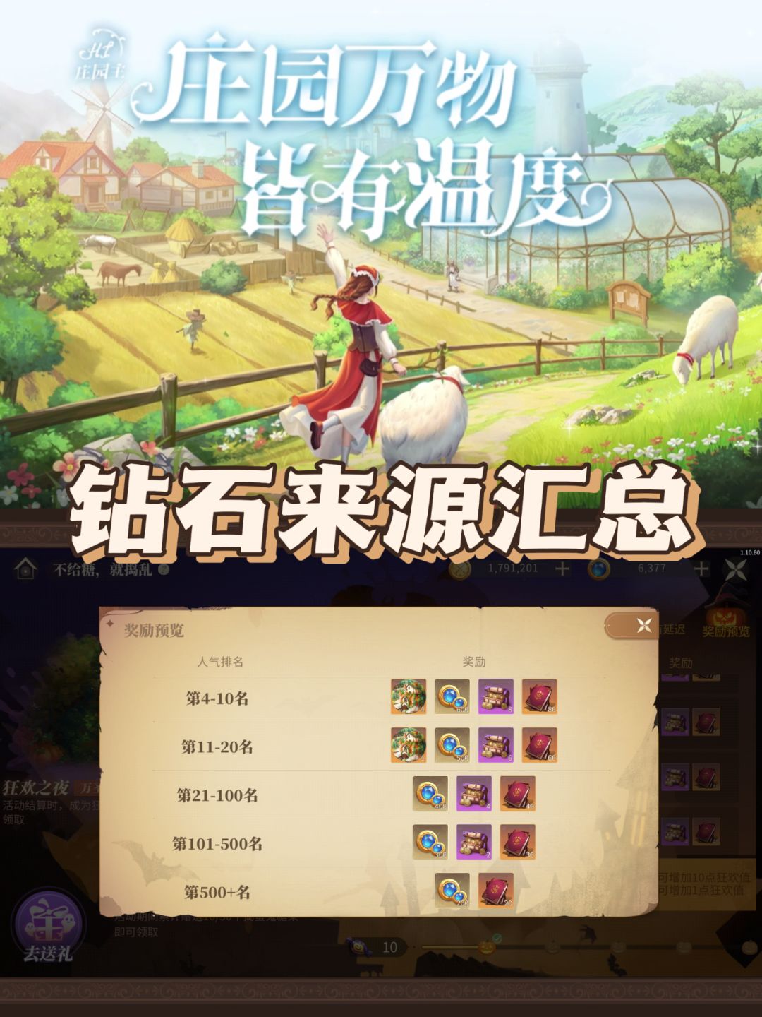 应小伙伴要求出一个简易的钻石攻略,给萌新们做一个参考。 参加活动换各种证的情况下每天还是能攒几百钻石的[表情_送花] 而且各种活动以及周常排名等都会给钻石,所以综合情况下一周是可以攒不少钻的。 至于花钻石就要根据活动奖励来判断,农牧场加成/航海产量等藏品或皮肤比较重要,这类活动优先参加。 而伙伴方面选择则是根据个人需求,T0级别人权卡就是图里那几个,其他只是下位替代或委任工具人。 #新庄园时代 #
