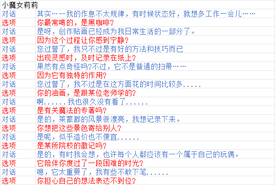小魔女贴画本:2感到宁静咖啡壶:1黑咖啡素材本:3出现灵感扫帚:1独特作用油画工具:1老师大部头专著:3有关魔法风景画:3寄给别人徽记胸针:3院校兔子布偶:2困难的时光被布盖着的画板:3想法表达好感度达到可以直接捡的东西:玛娜粉尘,勇敢徽章,彩虹碎块。来对对答案嘛来对对答案嘛来对对答案嘛,遗忘药水够用吗?