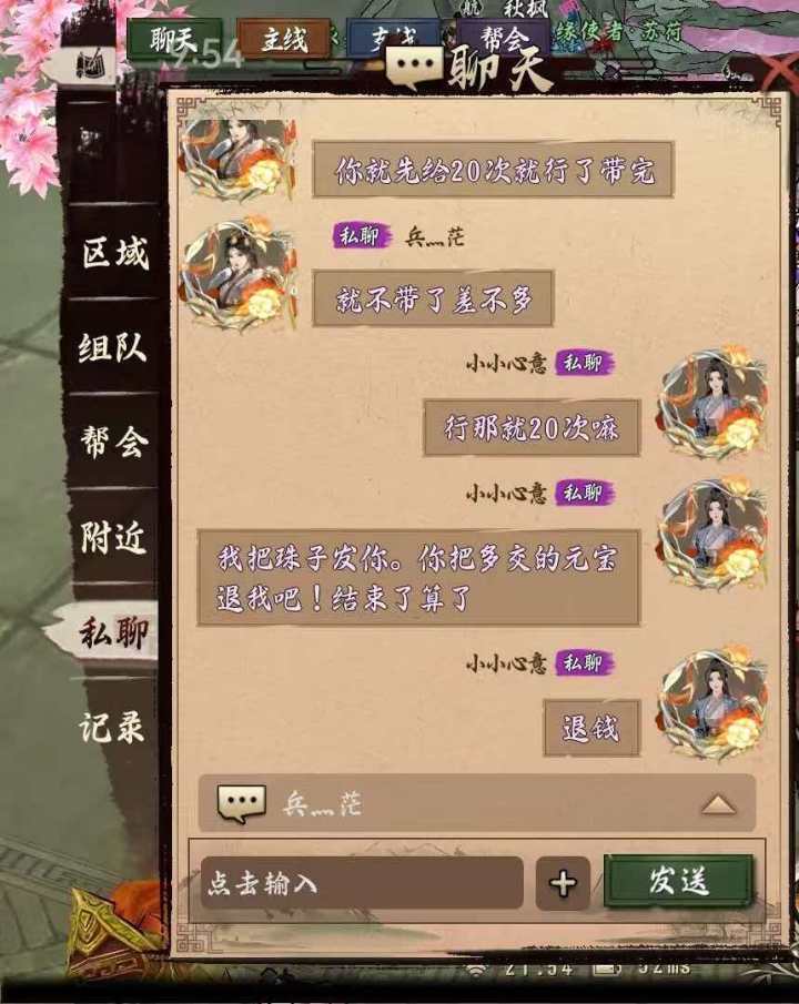 不讲信用毁坏玩家信用危机,诈骗坐车,事情缘由约定坐车边慌五人20次情节描述如下打完第三把结束过后,兵灬茫,一直旁边打坐不动等了几分钟大概3-5分钟,我在队伍有问什情况未得到回复后续终于等到人回来了他说上厕所去了,我也就没说什么了,后续进去第四把副本他一直不依不饶找我话说,我回复他上厕所没有说一声怎么还有理了,然后被踢出队伍脱离副本,后续我私信要求退回车费未得到回复(对了我交易他退费我珠子全