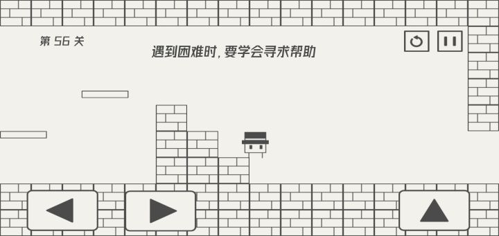 攻略51-6051 暗藏玄机右边平台在下面顶一下钥匙就出来了(附图)52 学会变通真的很重要点一下中间旋转平台即可更换方向(不附图)53 芝麻开门把“芝麻”拖到门上就可以开门了或字母输入“sesame”(附图)54 这次真的没有出口了把“没”字长按后点击删除 门就开了(附图)55 倒计时(我自己取的名字)等倒计时结束向左走即可(不附图)一时的失败,也许会给你带来新的出路继续向左走(不附图)56 遇到困难时,要学会求助吃掉左上方问号 尖刺消失(附图)57 此消彼长根据你的手机音量来操控平台高度(不附图)58 陷入困境时,不妨重新审视自己来过的路跳的中间后 拖动自己正下方的平台即可(附图)59 绝处逢生站在“绝处逢生”正下方 即可躲避尖刺在此点击即可离开(附图)60 飞打开飞行模式 即可无限连跳(不附图)打字不易 留个赞可好?这是我第四次玩这个游戏 最后看了四次广告 不知道作者能不能有四次收入