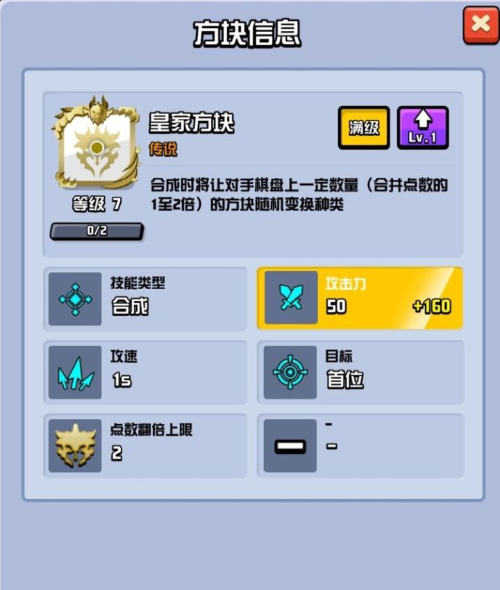 来了来了 窝是星仔 更新了 皇家方块 和随机成长方块 六套对战推荐 不要错过哦首先是新骰子解析 正篇在下面哦先看一下皇家方块 :局外升级增加攻击力 局内升级也同样是直接攻击力 没有特殊效果 可以在前期增加一点容错率我们看一下随机成长方块:可以看到局内升级减速成长时间 局外升级也减少成长时间,但是发现没有,他的攻击力只有10,而且不做增加,前期容错率很低,并且15级满级,和充能满级后还会有