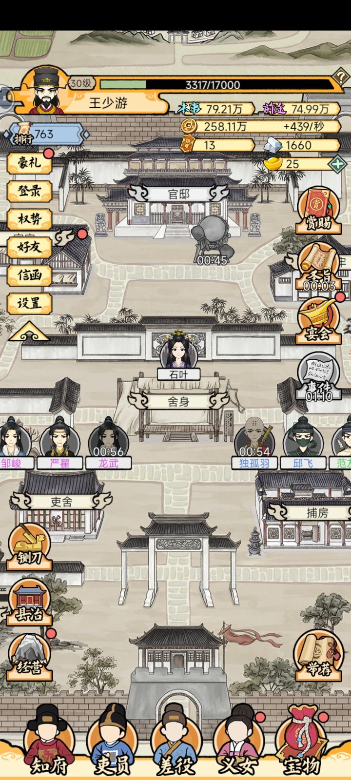 其次本游戏操作混乱,数值策划极其扯淡,看似是经营,实际上基本上是抽卡,就是用概率性来填补数值设计的不足,就比如他要推进,各县的判案例成效增加吏员,你增加的人员会去你手下的地方学习武艺增长本事,但是每个地方每次只有两三个人,可以用元宝提升,但加成极低,也就是,本来各项数值增长就慢,人越多概率越大,增长更慢,更恶心的是不管你数值多高,最后都是个百分比概率入仕,根据苹果音乐的播放定律,游戏中所谓的概率都是扯淡的,就好比原神的抽奖看似有概率,实际上也就是当次数到达了就固定触发,说白了就是利用赌徒心理硬拖玩家的在线时长,去做收益很低,操作很繁杂的经营。