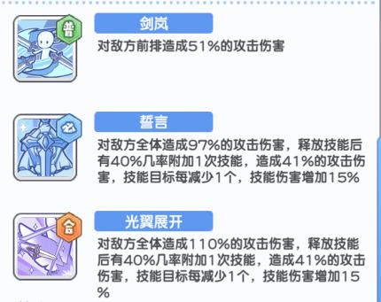 先来看一眼露易丝的技能描述 普攻和必杀合击都是对位纵排输出,不同的是露易丝必杀的高倍率伤害,常驻必杀212%伤害,合击必杀更是有高达241%的伤害加成,并且会增加自身5%的伤害以及暴击率 再看一下露易丝的进阶特性以及核心特性。 二星特性 四星特性 五星特性 核心特性 点评: 露易丝的所有进阶特性都是追击追击再追击,核心的效果也是追击后的持续加伤。目前露易丝的追击分为三种:击杀后追击、放技能后追击、