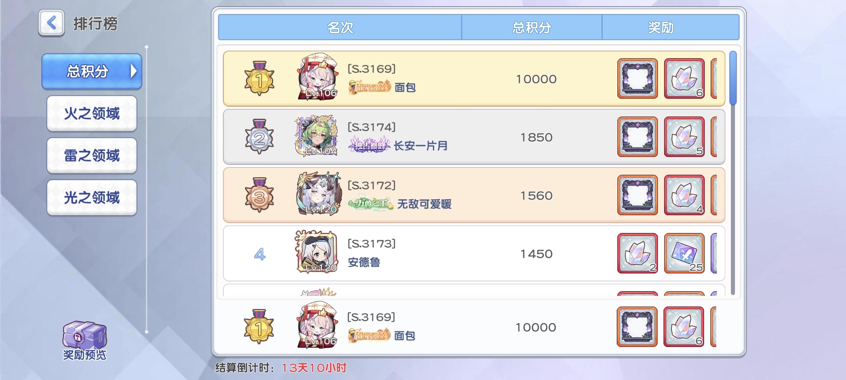 哈喽大家好这里是面包 这一期给大家带来 元素领域的顶配打法 对于大部分玩家来说,需要选择克制的属性 然后选择对应的种族角色 但是顶配这套打法,基本都是同一个队伍 咱这边已经达到了3020分 这是怎么打到的呢?仅供参考 由于是顶配打法 ,所以对于队伍来说需要满配 火之领域 水之领域 风之领域 雷之领域 对于正常玩家来说,每一个都要换来换去角色 但是对于顶配玩家来说,似乎还有另一种方法 1)队伍配置(