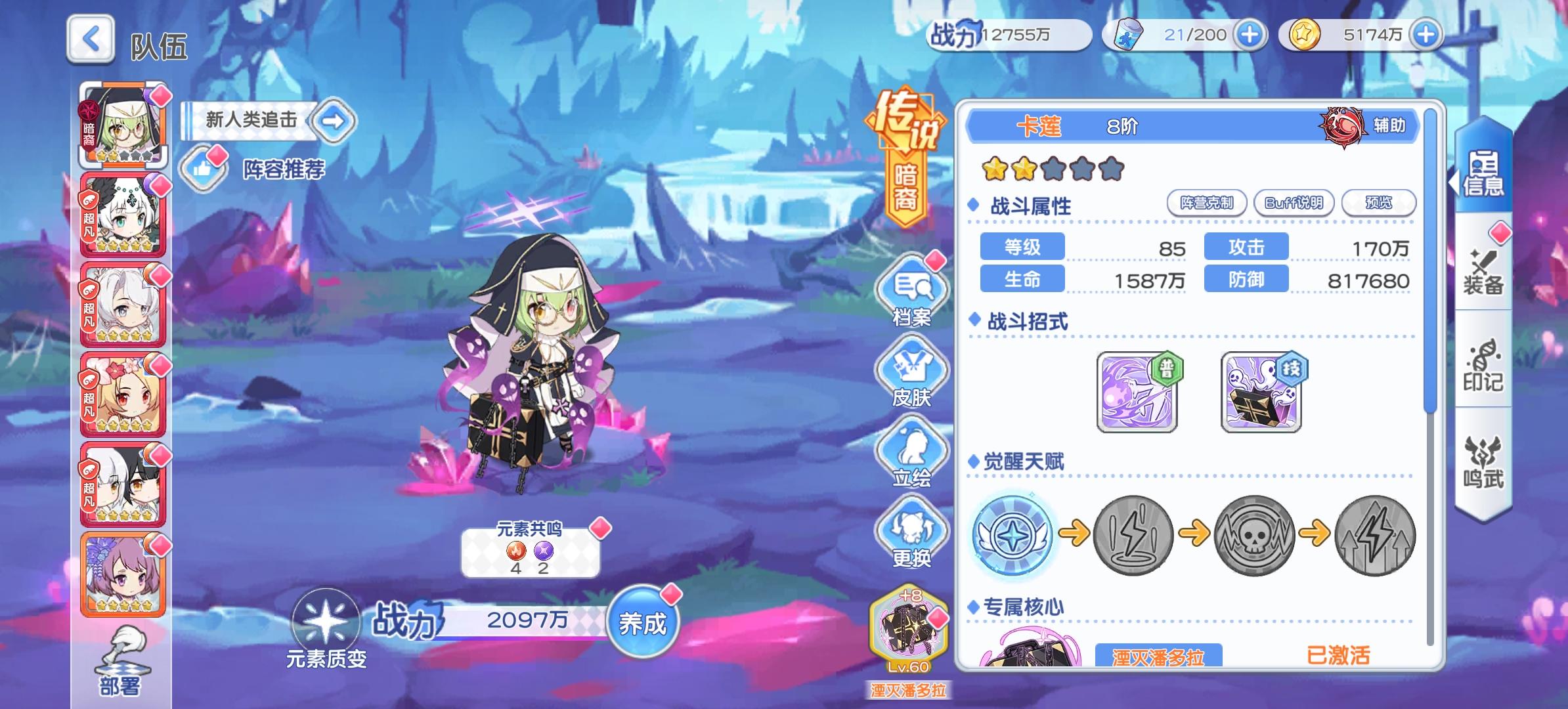 发现有很多人不会打元素650分那关,我也是拿过两期1950了,帮很多人凹过,所以来出一下攻略原理就是650分这关可以无限叠剧毒来击杀,所以有三套简单阵容,实测都能过。光之领域会有点难。阵容道具截图给你们发出来。第一套就是直接53吸血鬼姐妹过,元素一定要点三火三暗,然后注意亚莉莉别带怒涛,让他每次放技能的时候能量够就行了。第二套就是没有亚莉莉的,可以用判罪来代替,质变给赫卡特点就可以了。第三