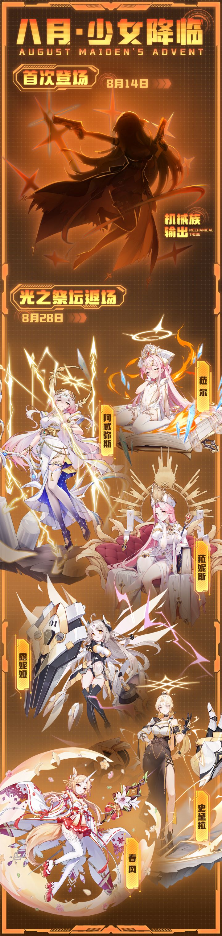 亲爱的指挥官,月鸽带着8月的卡池信息来了咕~这个8月,不仅会有光道使的全员返场更有神秘的新机械少女上线!指挥官们可以猜猜看,她是什么模样哦~更多关于新机械少女的信息,请期待月鸽后续的推文介绍~除了卡池信息,月鸽也整理了8月版本更新后即将上线的重点优化内容~一、深渊优化深渊副本新增【仅重置BOSS】功能优化时间:深渊新赛季开启后