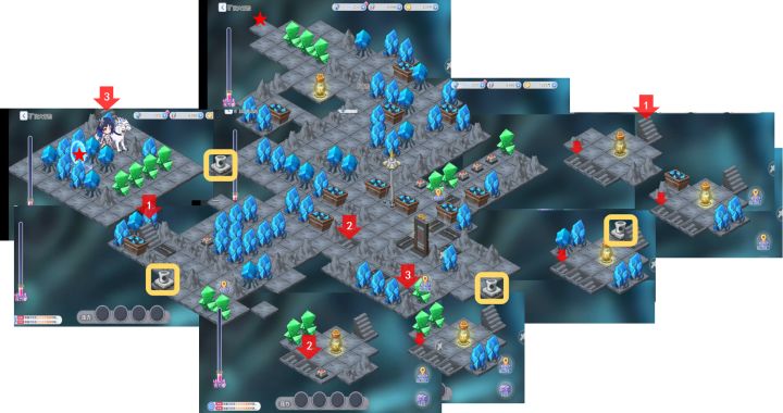 说明:1.红色五角星标注的是起点和终点2.左下方红1楼梯上去会传送到右上的连环小浮空岛,一直选最左边的楼梯下,直到出现2个下楼+1个按钮的小浮空岛,杀怪从下面那个红2楼梯出,传送到主地图。再向下杀掉红3楼梯的守门怪,进入传送到左上的大浮空岛,杀怪通关。3.黄色方框圈出来的装置,全点一遍后可以开全图,同时清空压力值。按钮、开关、宝箱一览无遗。4.开启最终宝箱需要把前面的宝箱奖励拿满,差几个点
