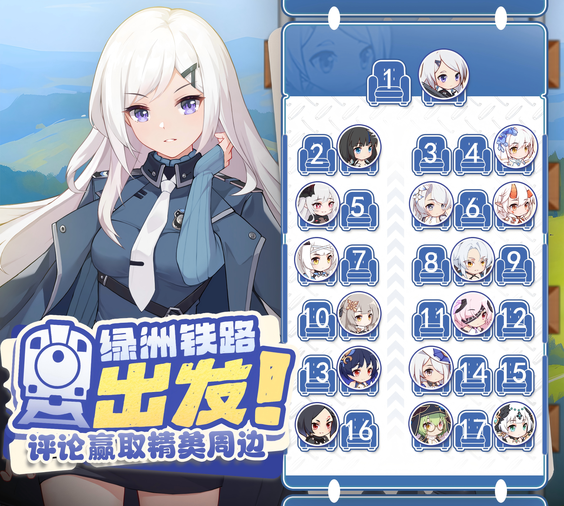 指挥官,辛苦啦!又是一周的辛勤冒险,到了回城放松的时刻~新一班的绿洲铁路即将出发!下一站,绿洲南~如果是指挥官的话,会选择哪个座位呢?在下方留下入座的编号和理由,月鸽会在1月22日抽取4位指挥官,送出“光暗少女主题鼠标垫*1”哦~【礼包码】通往冒险的旅途礼包内容:钻石*300、空投指令*1、金币*50000礼包使用时间:2026年2月28日前