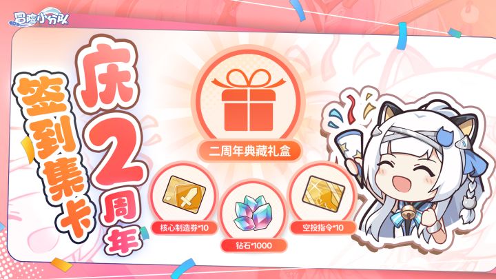 亲爱的指挥官:二周年签到活动来啦——🎉活动时间🎉2025-07-06 10:00:00 至2025-07-27 23:59:59🎉活动说明🎉⭐累计签到9天,总共可领钻石*1000、核心抽卡券*10、空投指令*10⭐活动礼包每个账户仅可获得一次⭐参与活动还有机会获得【光少女主题鼠标垫】和全新周边【二周年限定典藏卡盒】哦~🎉活动入口🎉⭐ Tap搜索“冒险小分队”,进入游戏详情页👉游戏